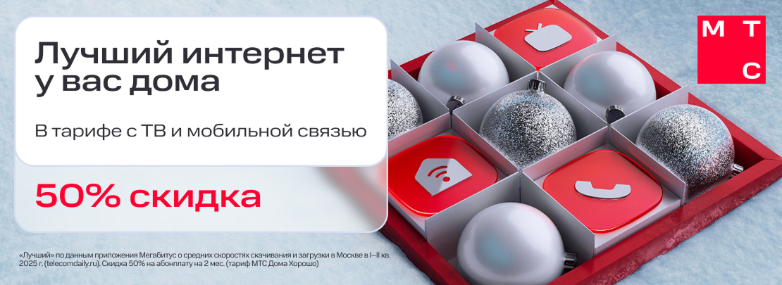 МТС дарит подарки: праздничная скидка 50% на первые шесть месяцев. Подключайте тарифы с домашним интернетом, ТВ и мобильной связью и наслаждайтесь выгодой в новогодний период